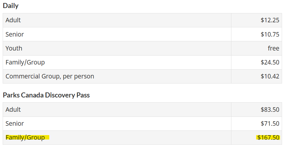 Preise für 2026 (nachzulesen hier auf der Seite von Parks Canada)