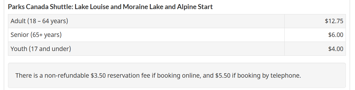 Was kosten die Parks Canada Shuttles?