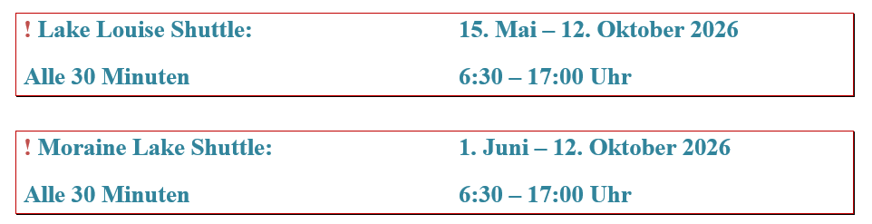 Es gibt jedoch einen barrierefreien Shuttle („Accessible Shuttle“) für gehbehinderte Besucher, der sowohl zum Lake Louise als auch zum Moraine Lake fährt.