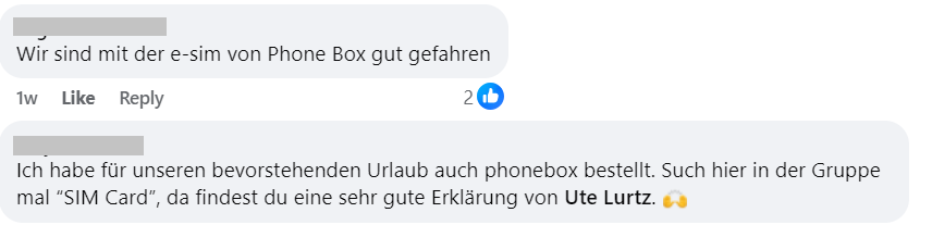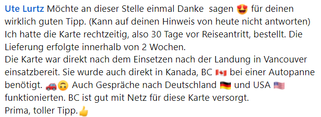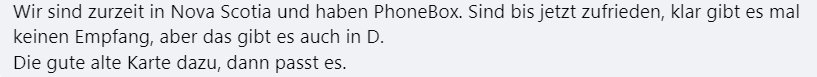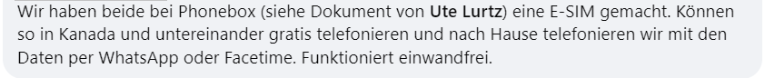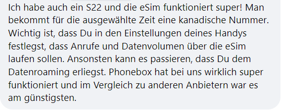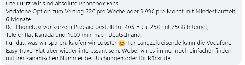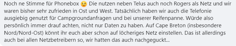 PhoneBox gibt es schon seit 2011 und sie haben eine Niederlassung jeweils in Vancouver und Toronto. PhoneBox ist eher ein Online-Verkäufer und mit den neuesten Handys, die eSIM-fähig sind, ist diese Option sehr beliebt. Weil es nicht viele Niederlassungen gibt, kann PhoneBox günstige Tarife anbieten. Hier ein paar PhoneBox Erfahrungen von anderen deutschsprachigen happy Kanada-Reisenden (Facebook-Screenshots).