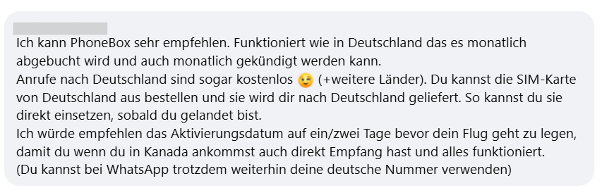 Hier sind einige Erfahrungen von deutschsprachigen Kanada-Reisenden mit PhoneBox (Facebook-Screenshots).